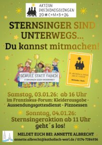 Wir freuen uns über weitere Kinder, die Lust haben, bei der Sternsingeraktion mitzumachen. Wer gerne singt, segnet, Gemeinschaft erlebt und dabei Gutes tut, ist herzlich willkommen, auch kurzfristig. Einfach bei Annette Albrecht melden, die ist für die Sternsingeraktion verantwortlich.