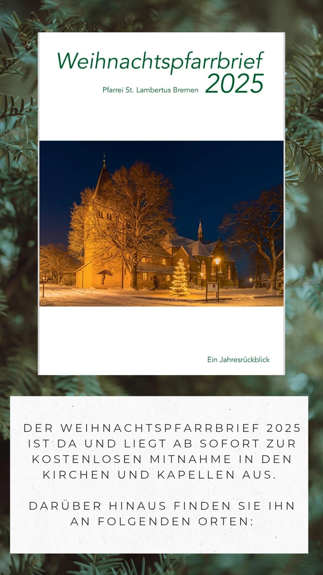 Die Pfarrei St. Lambertus Bremen hat ihren neuen Weihnachtspfarrbrief 2025 veröffentlicht. Der reich bebilderte Jahresrückblick liegt ab sofort in allen Kirchen und Kapellen der Gemeinde zur kostenlosen Mitnahme aus.