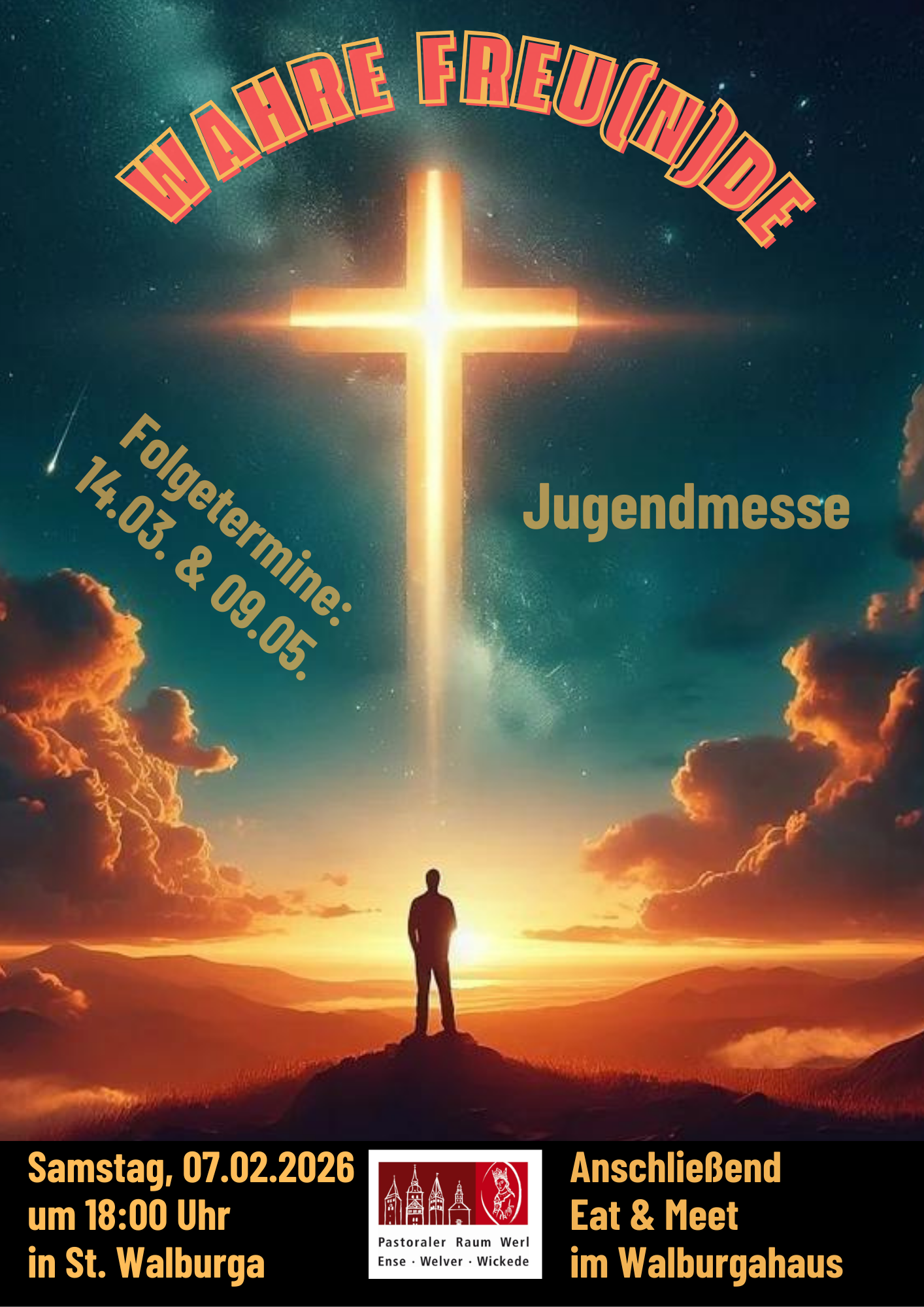 wir laden euch herzlich zur nächsten Jugendmesse am 7. Februar um 18 Uhr in die Propsteikirche zum Thema „Wahre Freu(n)de“ ein. Im Anschluss habt ihr beim „Eat und Meet“ die Möglichkeit bei gutem Essen /Stockbrotbacken über der Feuerschale und gemütlichen Beisammensein den Abend ausklingen zu lassen.