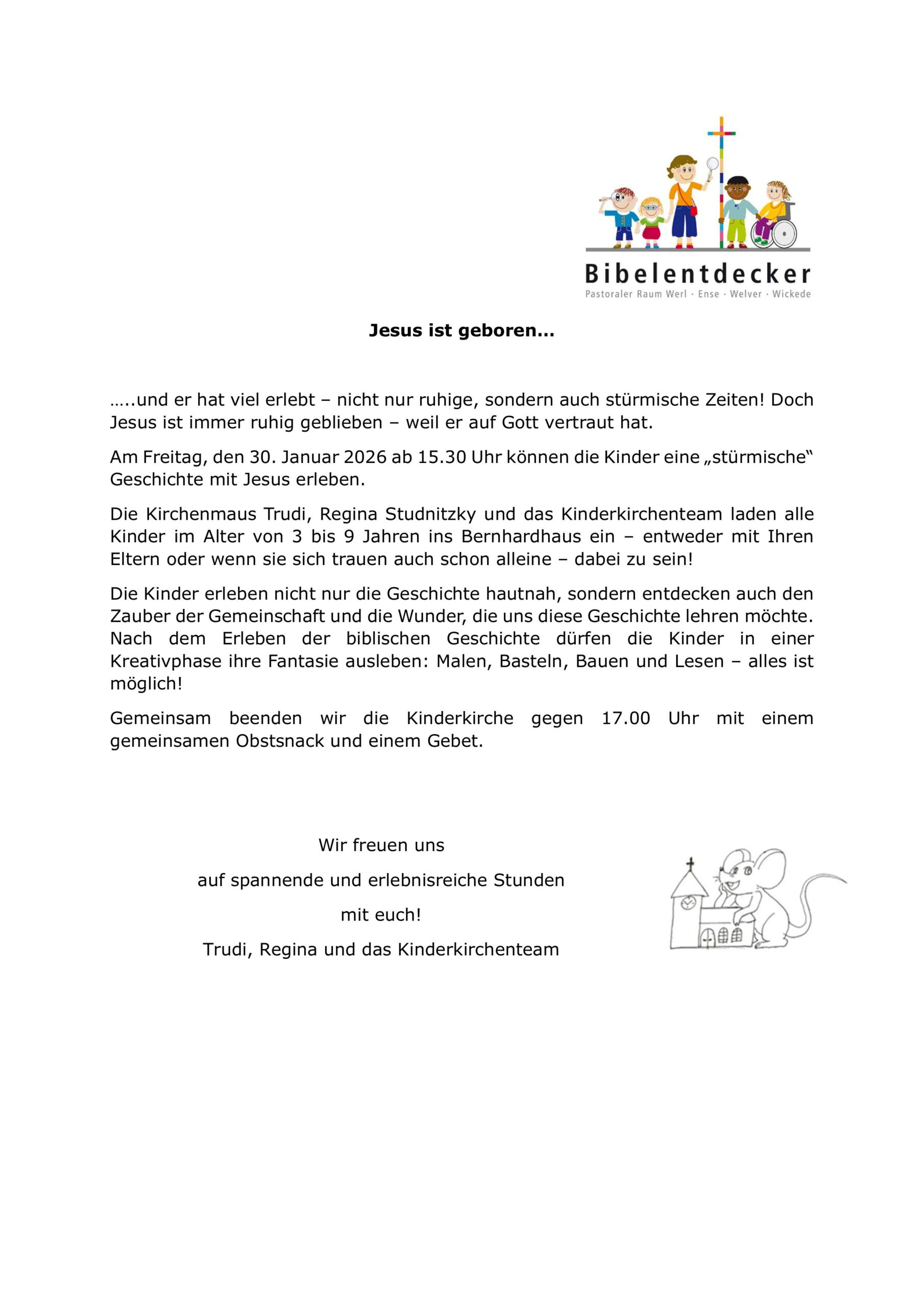 Die Kirchenmaus Trudi, Regina Studnitzky und das Kinderkirchenteam laden alle Kinder im Alter von 3 bis 9 Jahren ins Bernhardhaus ein – entweder mit Ihren Eltern oder wenn sie sich trauen auch schon alleine – dabei zu sein!